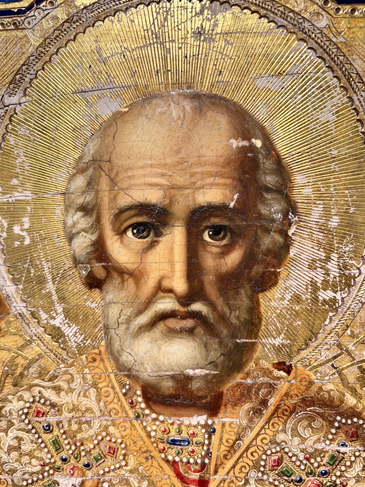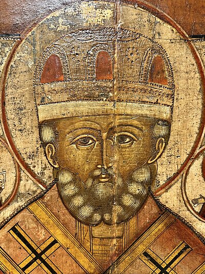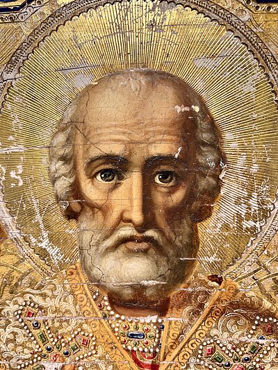 Die Bildtafel für wohlhabende Leute stammt aus St. Petersburg (Russland) und wurde Mitte des 19. Jahrhunderts angefertigt. Sie zeigt Nikolaus als Halbfigur. Was sofort auffällt? Der warme und elegante Goldton, in dem die gesamte Ikone gehalten ist, und die prächtigen Details.