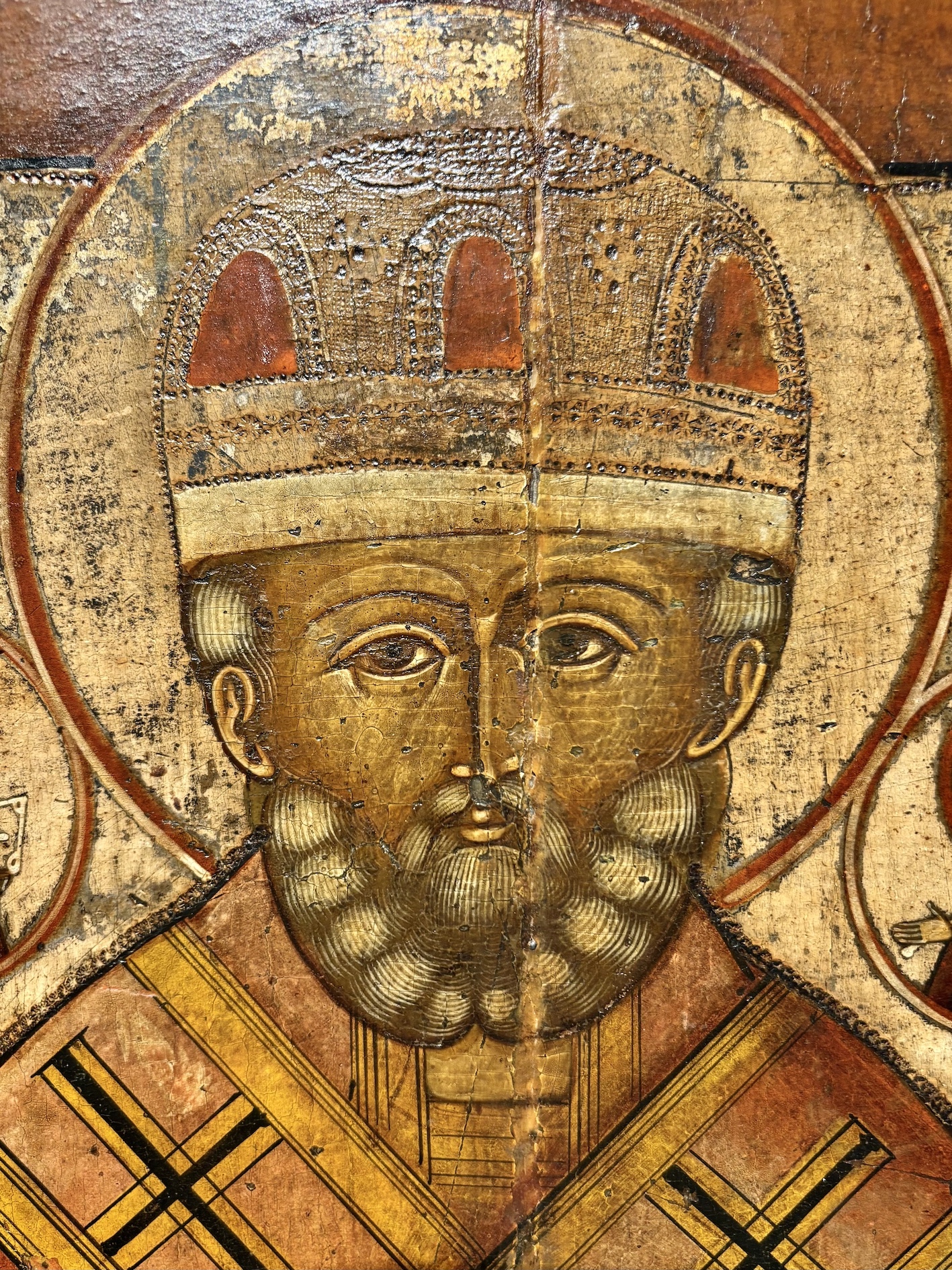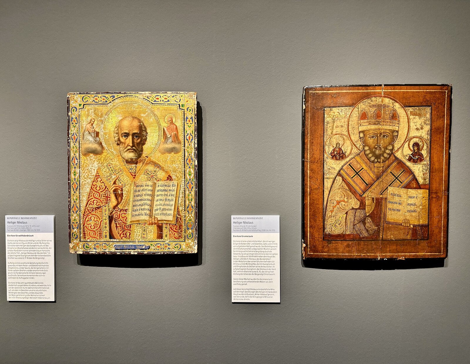 Zwei Nikolaus-Ikonen sind besonders interessant. Es handelt sich zum einen um eine Ikone für wohlhabende Leute und eine für ärmere Menschen. Beide Exponate hängen nebeneinander.